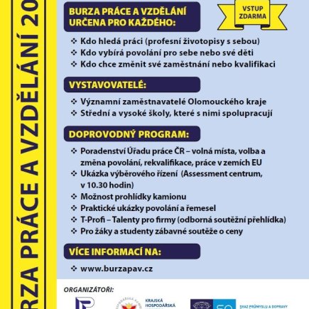 Bohatý doprovodný program – soutěž pro žáky a studenty o atraktivní ceny, laserová střelnice, trenažer bojového vozidla, ukázka Assessment centra, možnost vyzkoušení práce v hudebním studiu, krajské kolo odborné soutěže T- Profi apod. K vidění budou i zajímavé exponáty některých vystavovatelů (vč. vojenské techniky a kamionu) a praktické ukázky povolání a řemesel. Více na www.burzapav.cz.