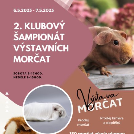 Zveme Vás na druhý klubový šampionát výstavních morčat. Můžete se těšit na 150 čistokrevných morčat s průkazem původu, prodejní expozice, stánky s chovatelskými potřebami nebo workshop o chovu morčat pro veřejnost. V neděli v 10:00 soutěž pro veřejnost-možnost zkusit si vystavit vlastní morče.